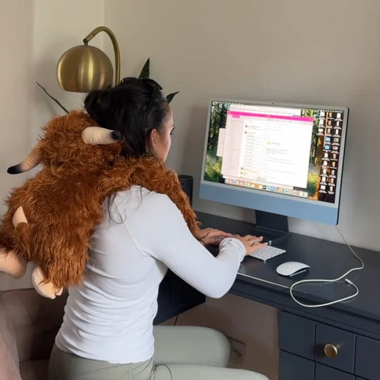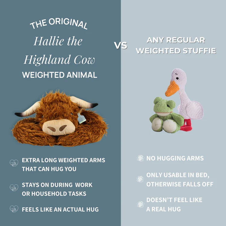 Meet Hallie the Highland Cow, a weighted stuffed animal with extra-long front legs that hug you back. Hallie helps you stay focused, feel safe, and reduce cortisol and anxiety. Whether you're working, studying, or winding down, Hallie brings the comfort of a warm hug anytime you need it.